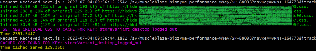- Generate and cache critical CSS: Modified the existing Critters implementation to check the cache first on the basis of the key provided in the previous step before generating the critical CSS. If the CSS is found in the cache, serve it directly. Otherwise, generate the CSS using Critters and store it in the cache with the same unique key for future use.